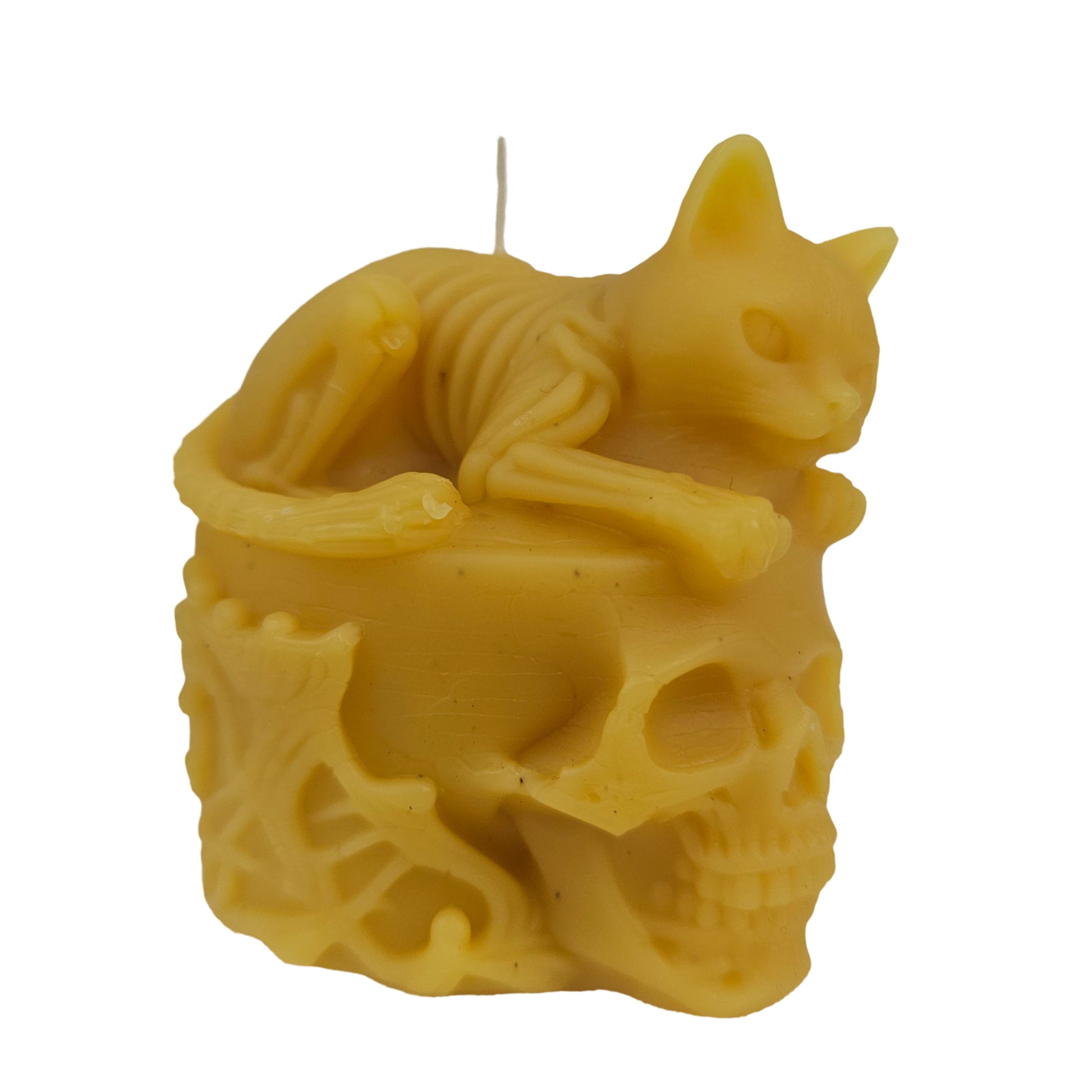 Super cute spooky pure beeswax cat on a skull candle. Stands approximately 2.5" tall and 3" wide, great for halloween or gothic collections.